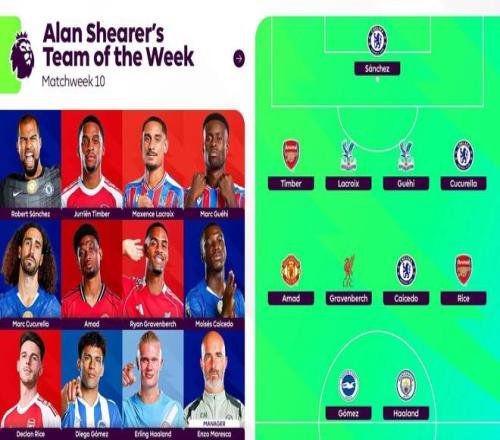 希勒评英超第10轮最佳阵:哈兰德、切尔西3人、阿森纳2人在列