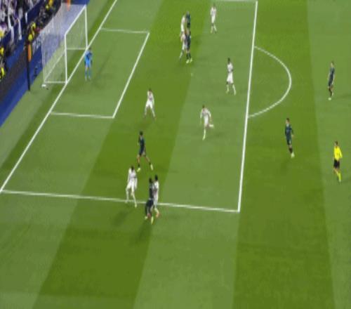 第28分钟,在左路队友牵扯了曼城防守人精力,右路队友撕扯开了空间基础下,贝林厄姆带球狂奔给到了罗德里戈机会。右路很空他几乎是没有遇到太多阻拦,就自主面对中卫及门将了。一个小角度低射破门,皇马1-0。