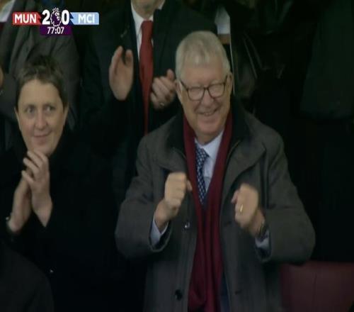 当镜头给到看台上的弗格森爵士时,这位84岁的红魔功勋主帅激动握拳庆祝,并为曼联的出色表现鼓掌。